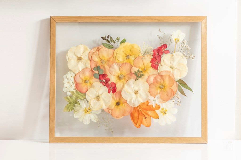 Our most common sizes for shadow boxes are 18×20/22 inches and 20×22/24 inches. Larger bouquets may require 22/24 x 26 inches.