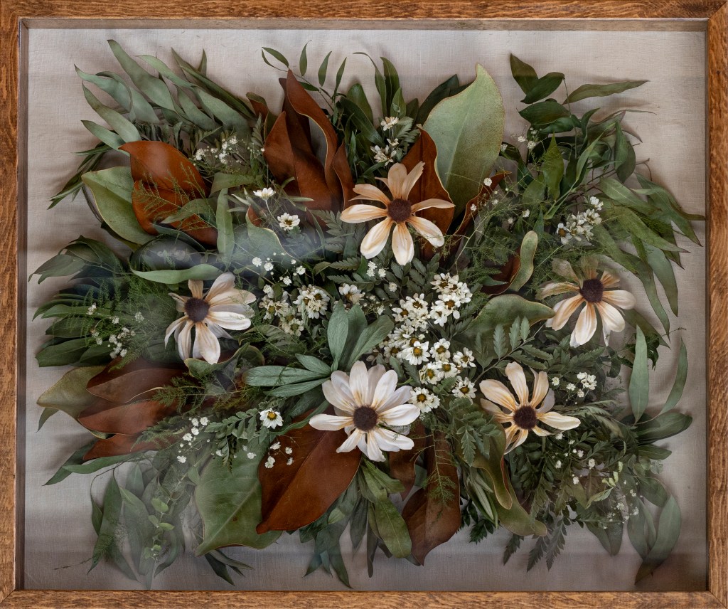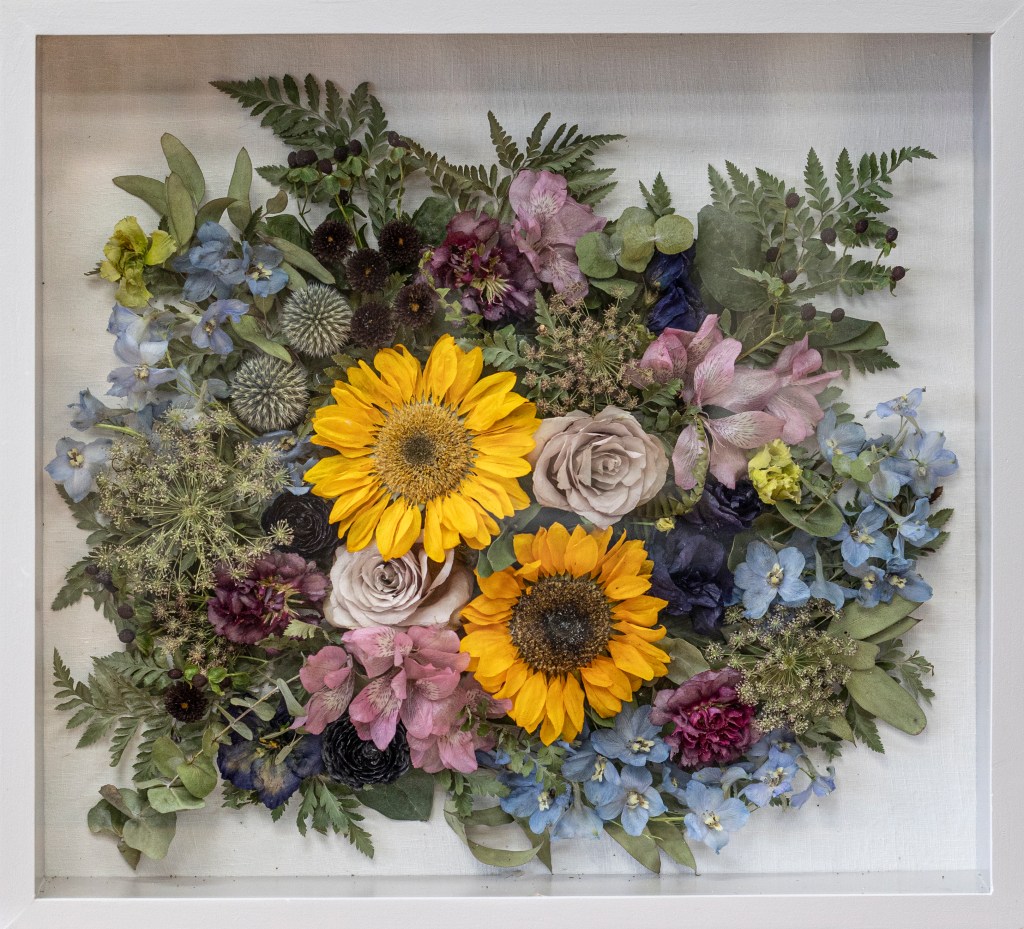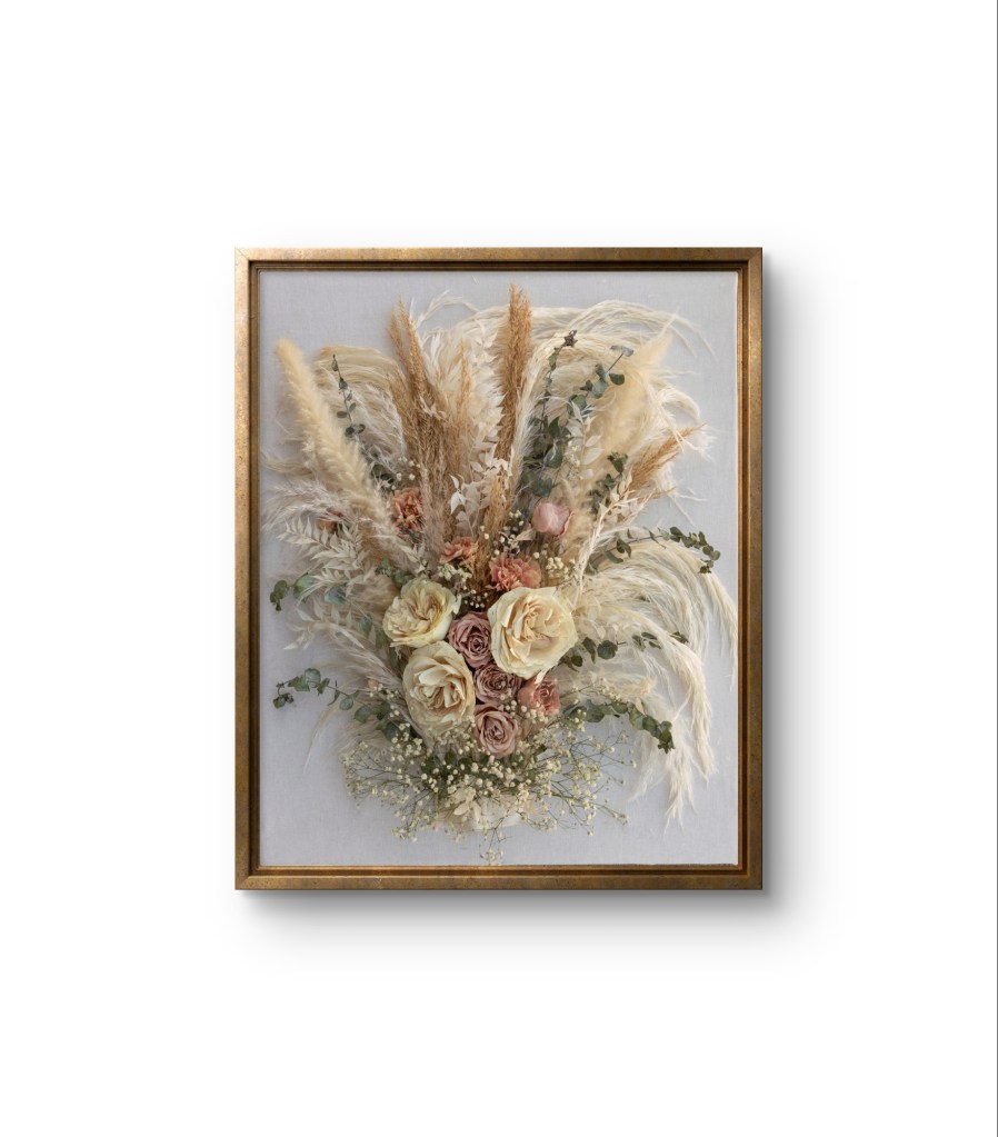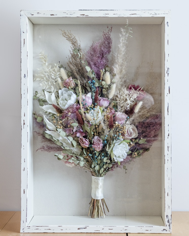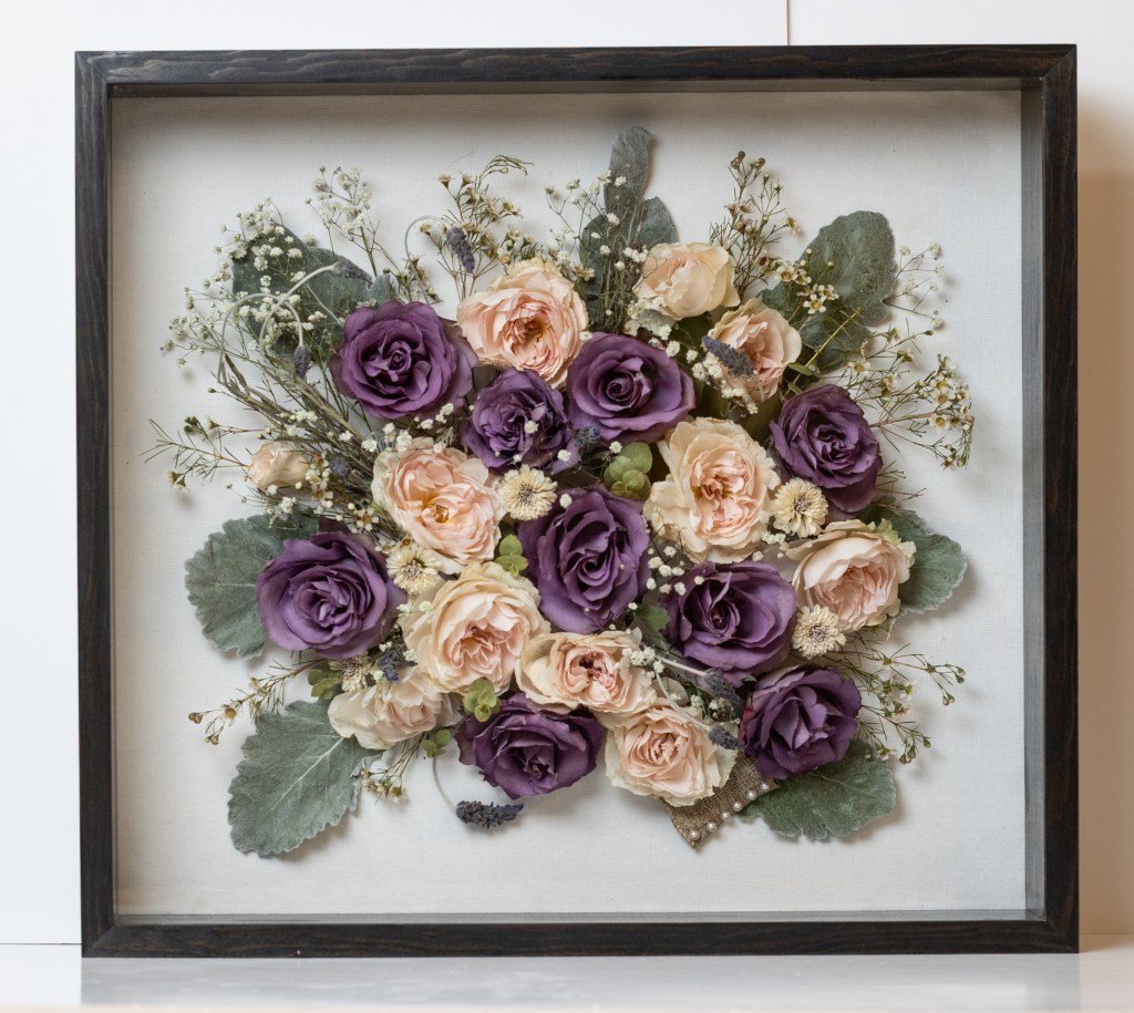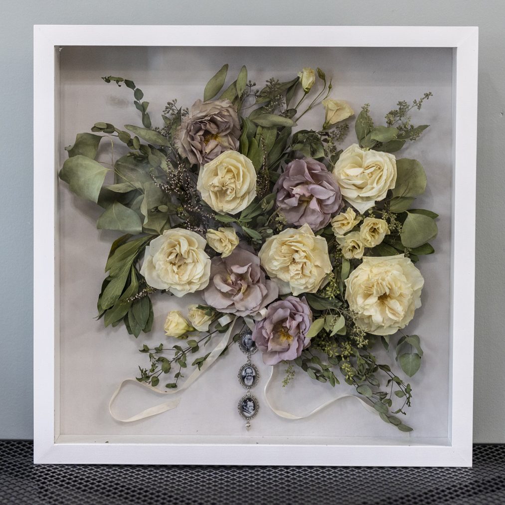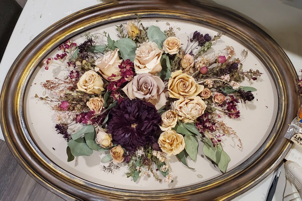 Bride dried her own flowers and kept them for a couple of years before I designed this for her. Frame was refinished by me.