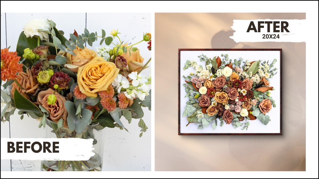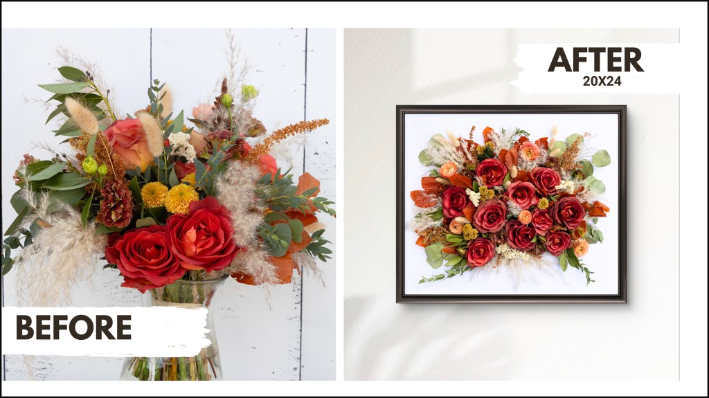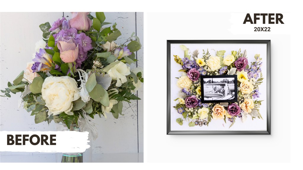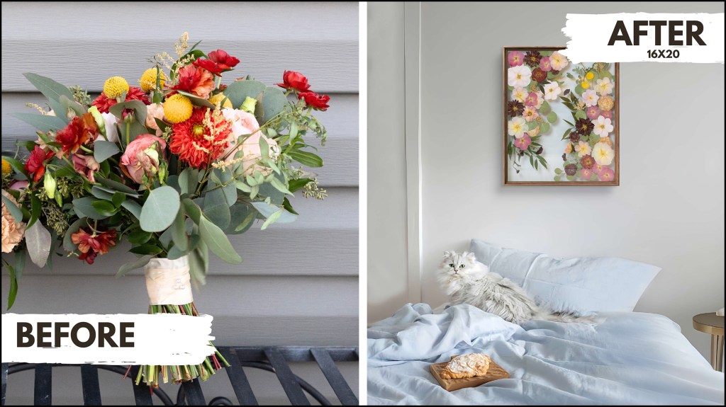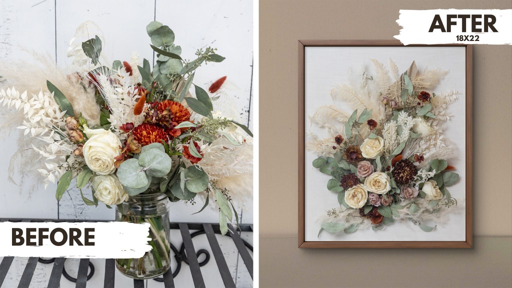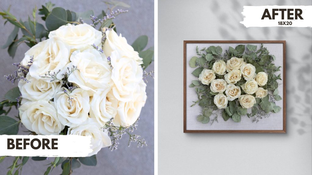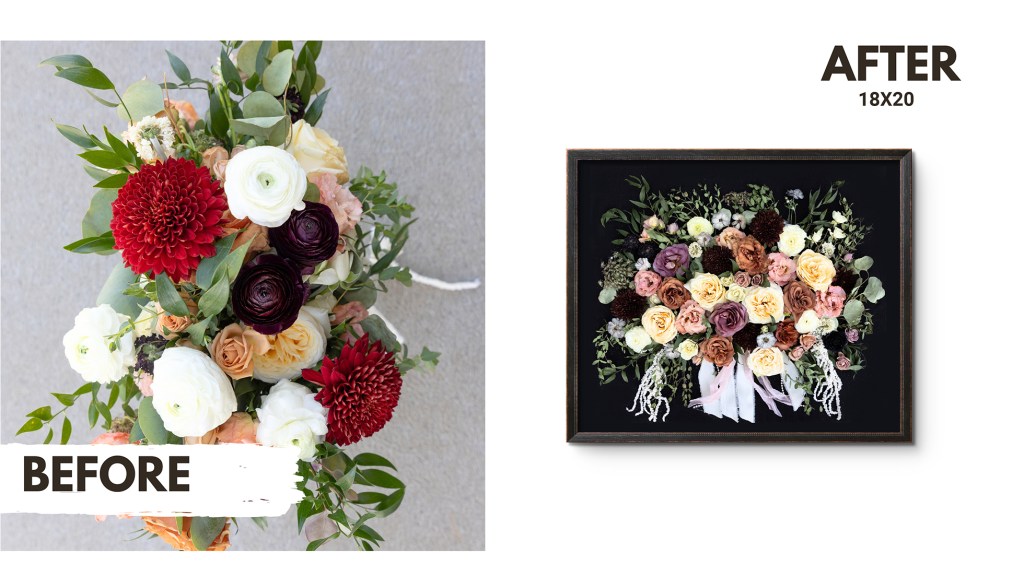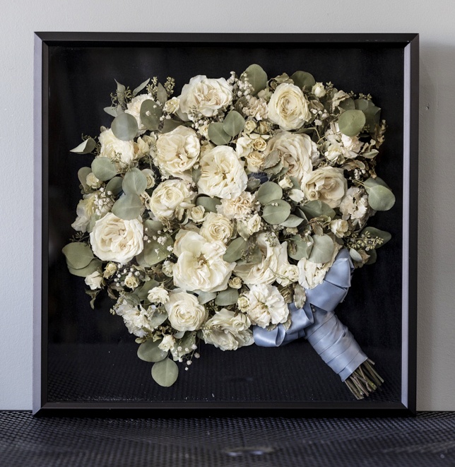 Bride dried the bouquet herself. We added a few more roses from her valentines bouquet (that I dried) so that we had a few roses that were open a little bit more.